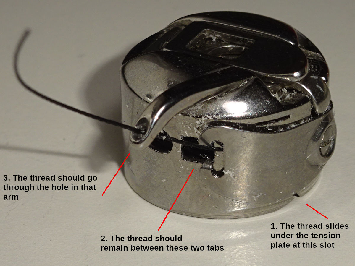 1) The thread should go through the hole in case's arm. I didn't do that for 2 months. It seemed to work ok. (I somehow got the idea the needle went though that hole.). But, it's supposed to hold the thread for the needle and shuttle hook to bring together. I'm surprised how well it worked. I probably missed the first couple stitches and didn't notice it. 2) The tension plate (on the outside of the bobbin case) has two guides which the thread should stay between. If it's not between those guides, the thread tension will be inconsistent. (This was more of a problem with a bobbin case I bought on eBay, below. The tension plate is different, maybe an older design.).
