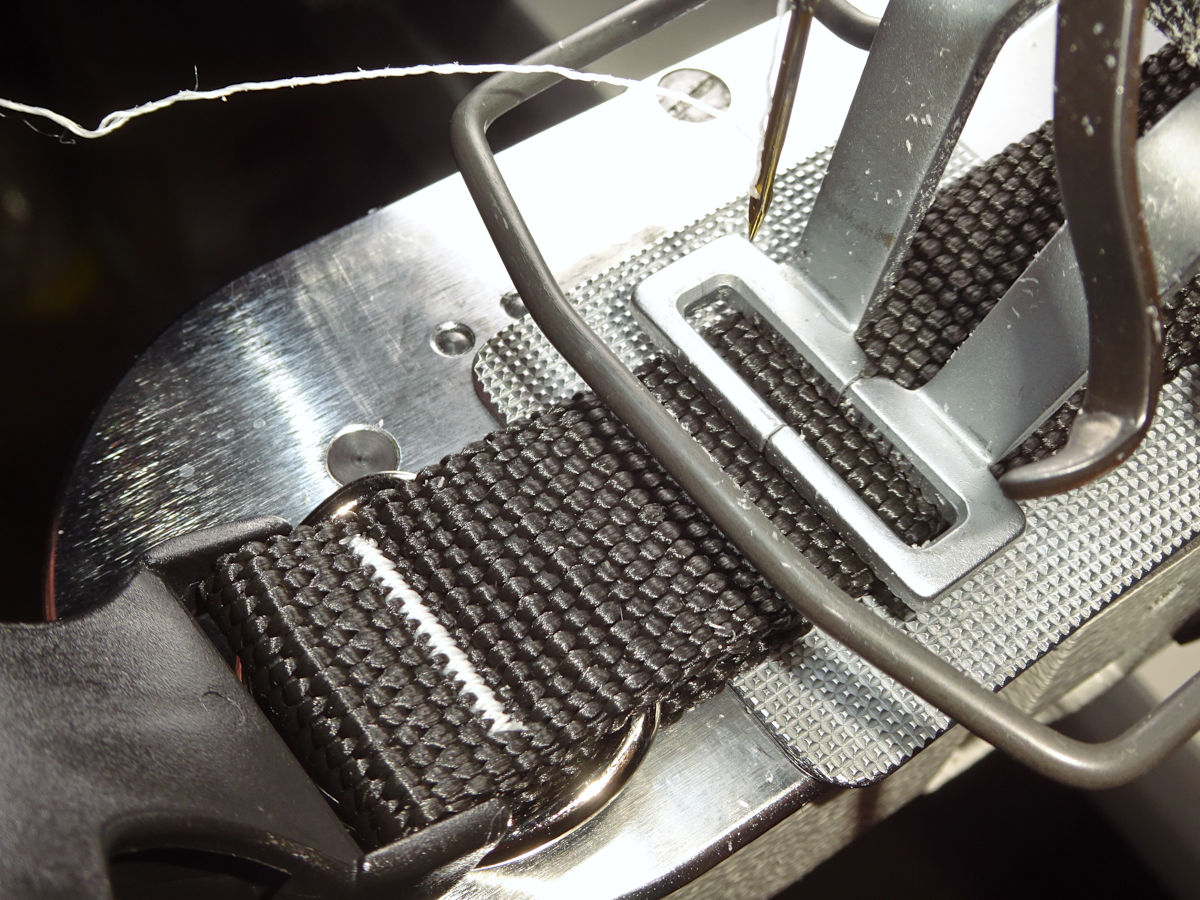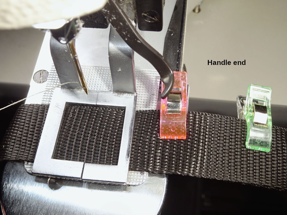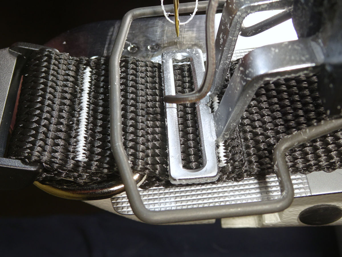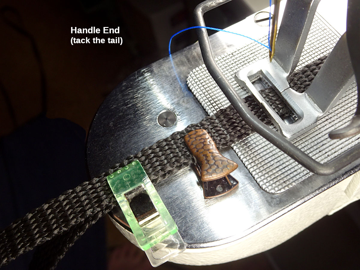 2) When sewing the buckle end: the weight of the opposite end is more of an issue. Don't let it hang off the edge of the table. That weight will amplify the vibration. Always make sure that end lays on the table. (But, when you sew one of the D-ring tacks, the oposite end end will point toward you. You want to hold it in a way that creates some slack between you and the clamp (The clamp should be able to swing side to side without any pulling at it.). For the other tacks on this end, the webbing points to the rear like it did for the tri-glide. Similar to sewing the tri-GLIDE end, you may find that lightly suspending it so it can move with the arch like it's floating in air is best. Or, helping it stay put by pinching down onto the plate, or even the screw head more firmly.