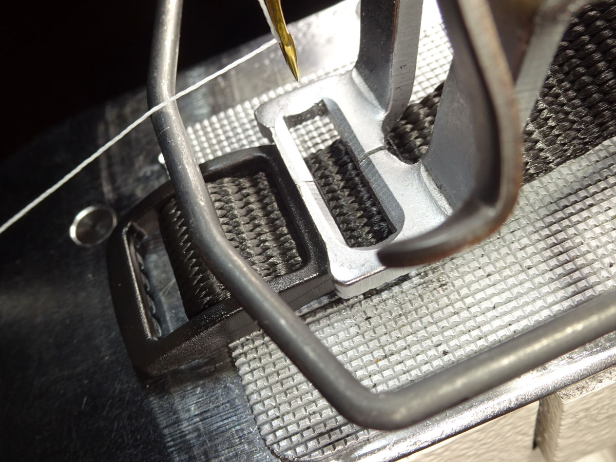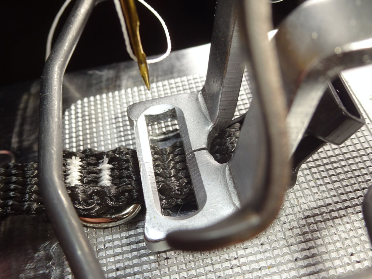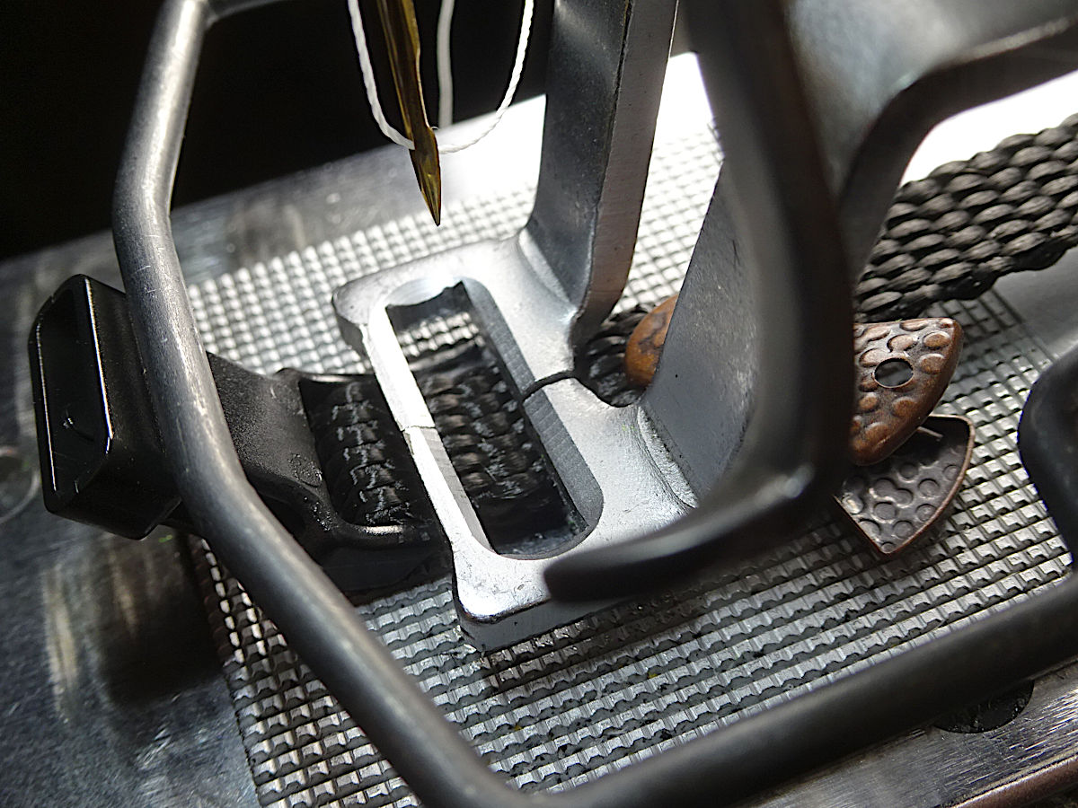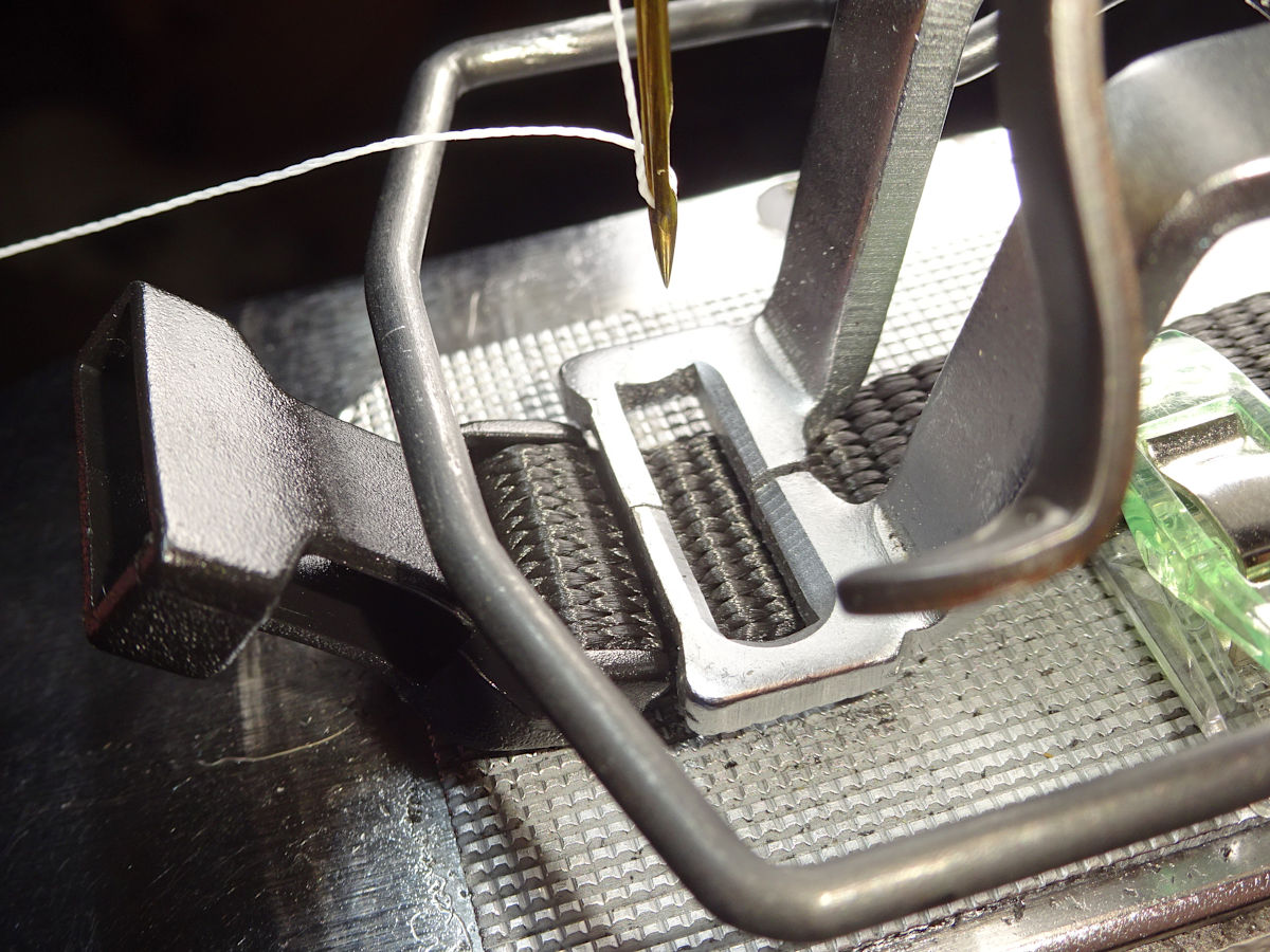 2) When sewing the buckle end: the weight of the opposite end is more of an issue. Don't let it hang off the edge of the table. That weight will amplify the vibration. Always make sure that end lays on the table. (But, when you sew one of the D-ring tacks, the oposite end end will point toward you. You want to hold it in a way that creates some slack between you and the clamp (The clamp should be able to swing side to side without any pulling at it.). For the other tacks on this end, the webbing points to the rear like it did for the tri-glide. Similar to sewing the tri-GLIDE end, you may find that lightly suspending it so it can move with the arch like it's floating in air is best. Or, helping it stay put by pinching down onto the plate, or even the screw head more firmly.