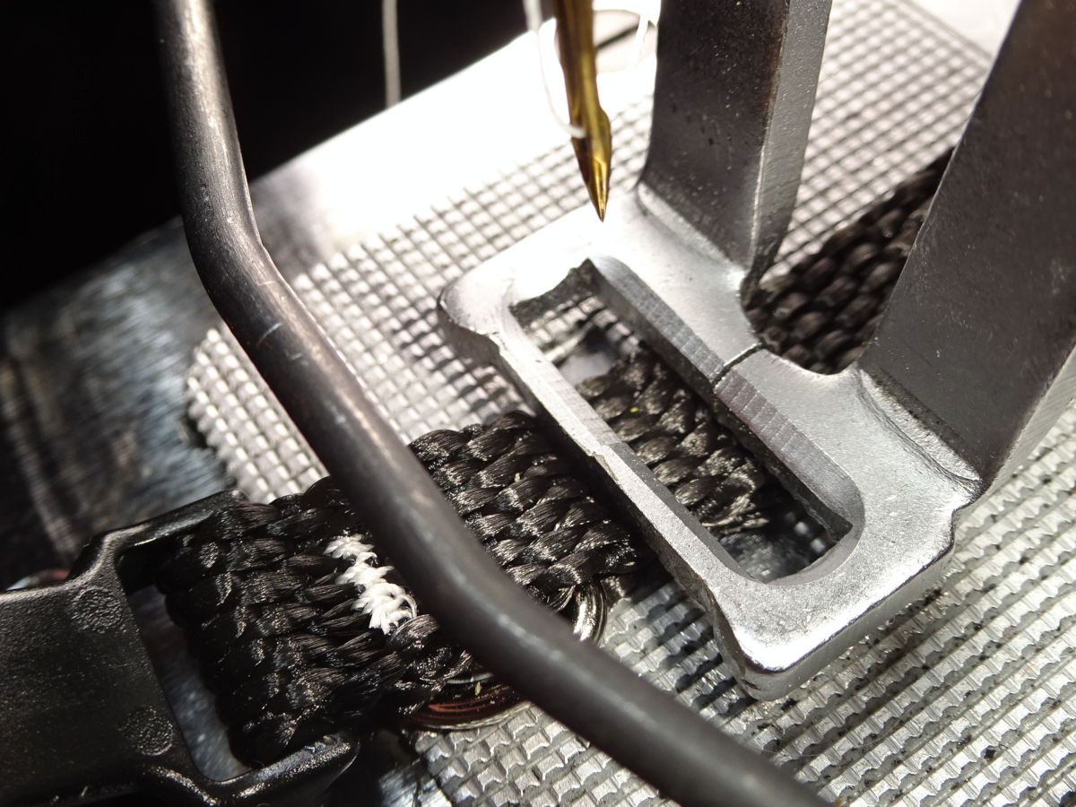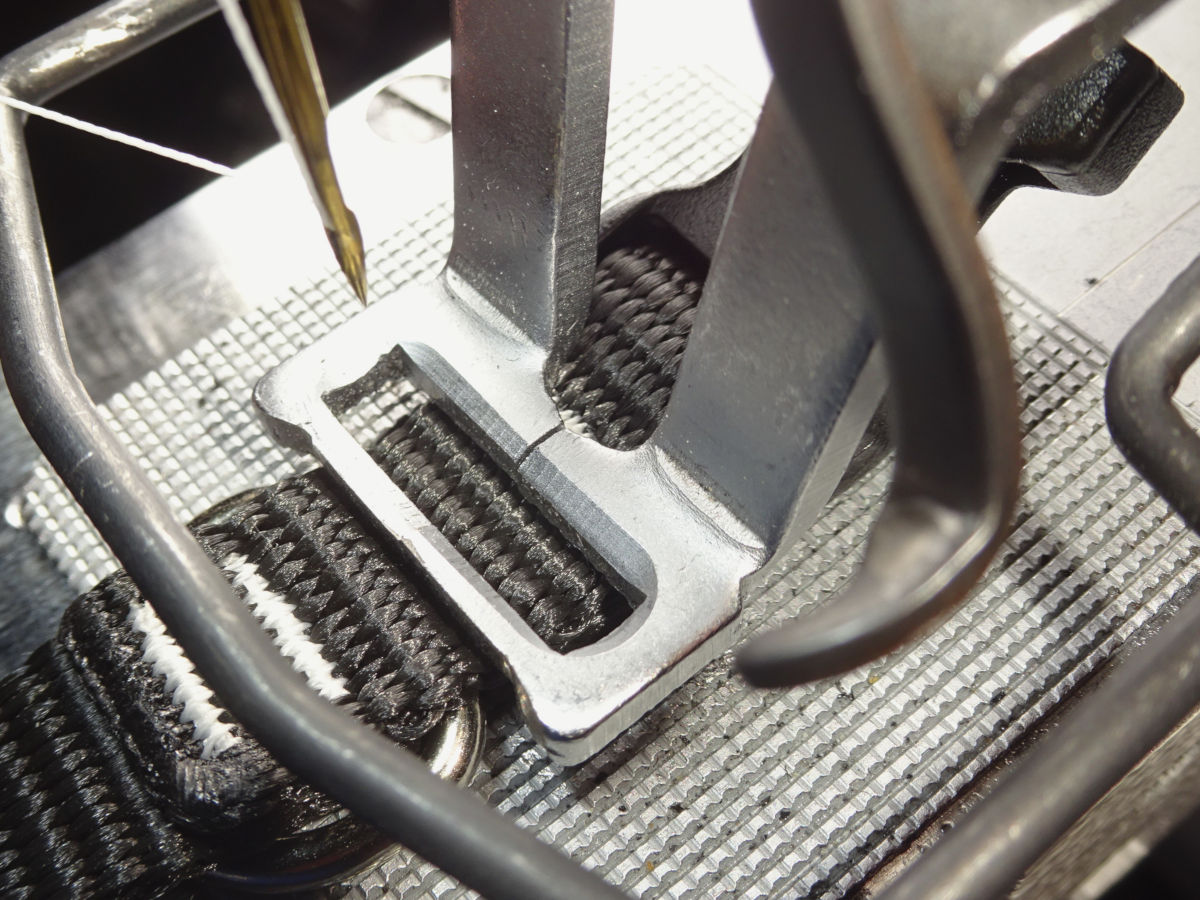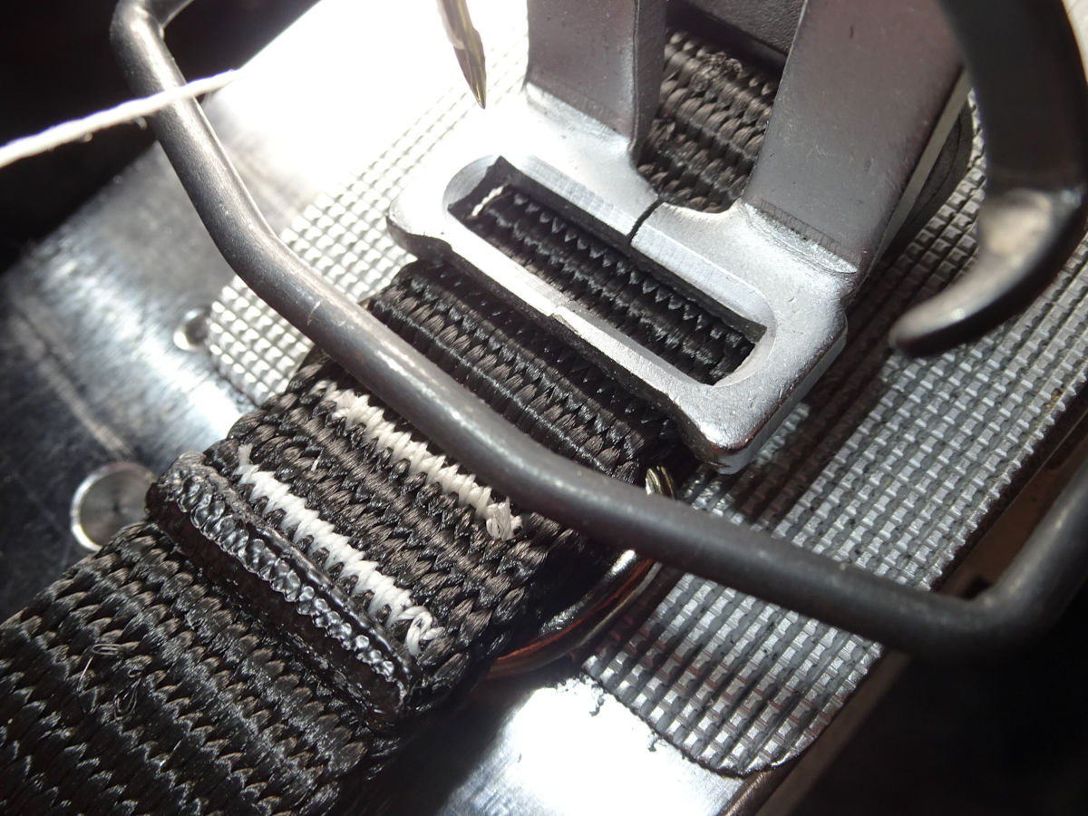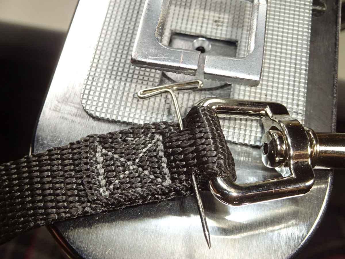 2) When sewing the buckle end: the weight of the opposite end is more of an issue. Don't let it hang off the edge of the table. That weight will amplify the vibration. Always make sure that end lays on the table. (But, when you sew one of the D-ring tacks, the oposite end end will point toward you. You want to hold it in a way that creates some slack between you and the clamp (The clamp should be able to swing side to side without any pulling at it.). For the other tacks on this end, the webbing points to the rear like it did for the tri-glide. Similar to sewing the tri-GLIDE end, you may find that lightly suspending it so it can move with the arch like it's floating in air is best. Or, helping it stay put by pinching down onto the plate, or even the screw head more firmly.