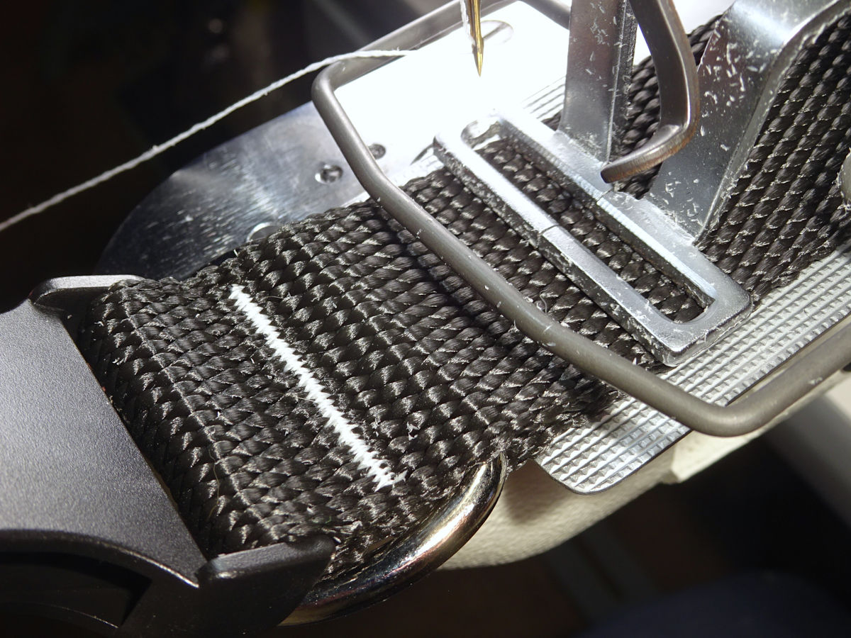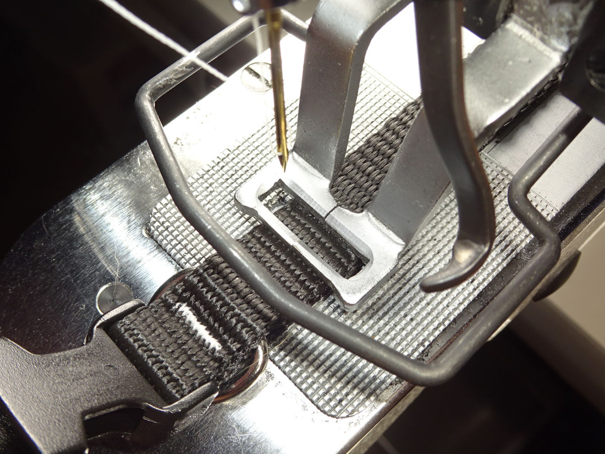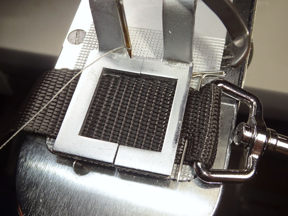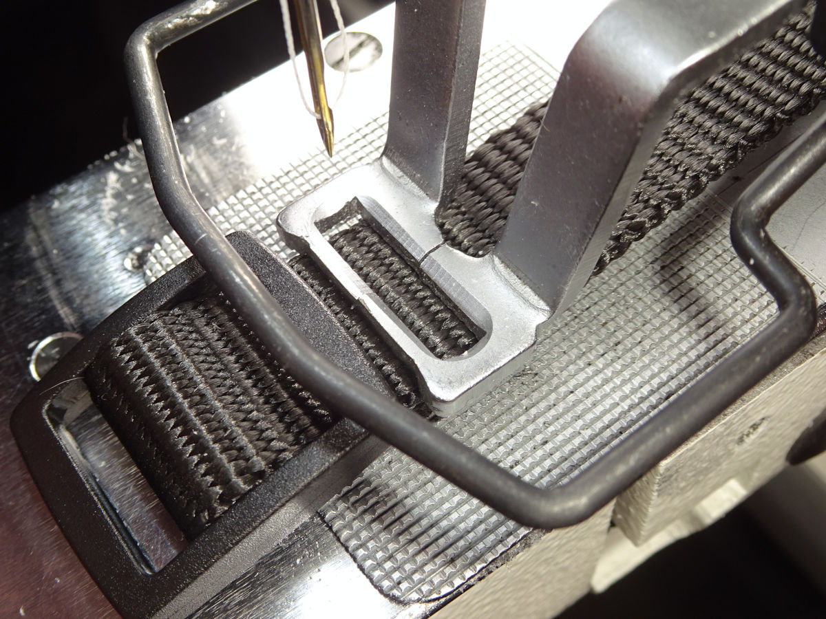 This uses the clamp & plate the machine came with. The photos are in the order of operations: 1) Tack the tail of the triglide end. 2) Tack next to the triglide (you can see the tail tack. Remember: I clamp onto the triglide itself. This is not a good way to start, may not even be worth doing at all. You can add 1/4" to the cut length of webbing, and use that here to clamp down onto the webbing for both tacks). 3) At the other end, tack closest to the buckle, then 4) the tail, 5) tail-side of the D-ring, 6) the other side of the D-ring (closest to the buckle tack):