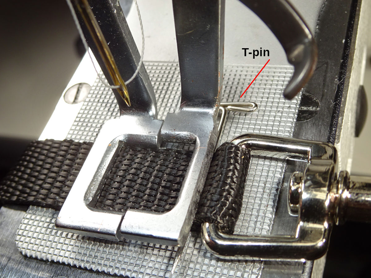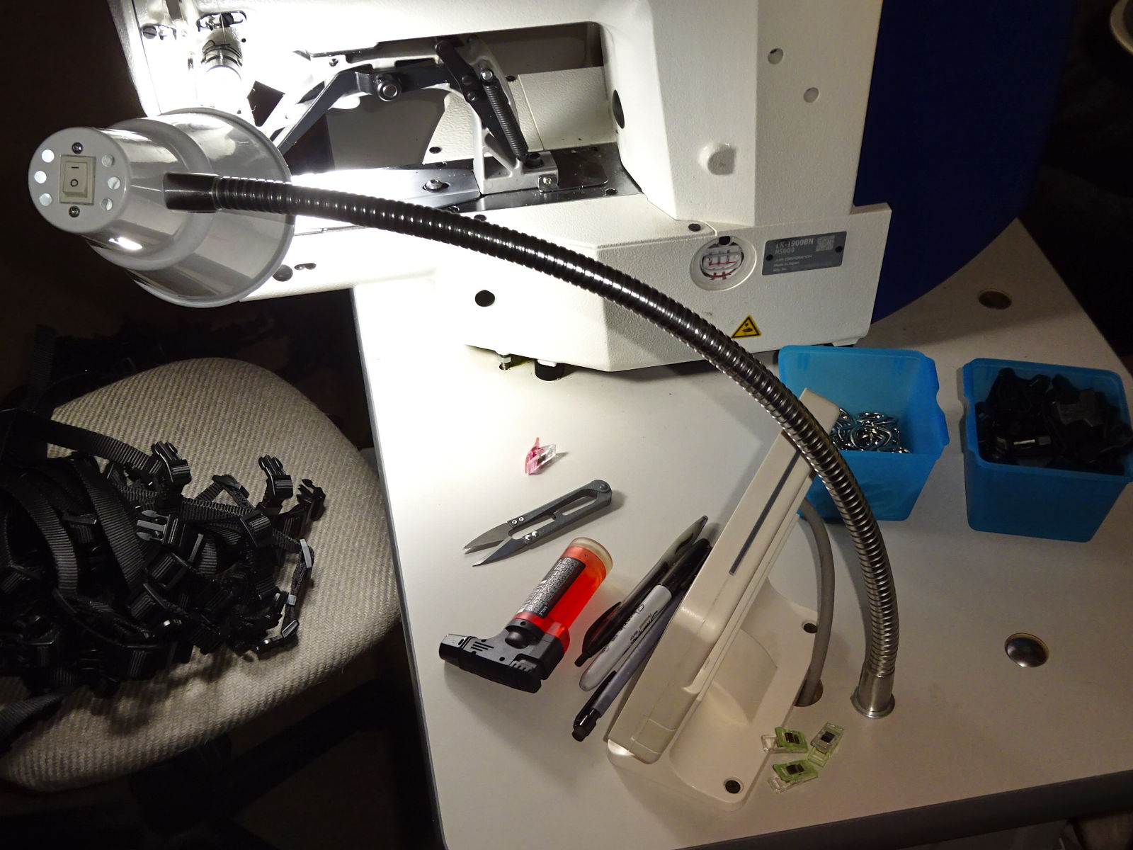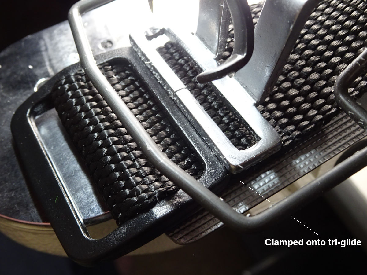 This uses the clamp & plate the machine came with. The photos are in the order of operations: 1) Tack the tail of the triglide end. 2) Tack next to the triglide (you can see the tail tack. Remember: I clamp onto the triglide itself. This is not a good way to start, may not even be worth doing at all. You can add 1/4" to the cut length of webbing, and use that here to clamp down onto the webbing for both tacks). 3) At the other end, tack closest to the buckle, then 4) the tail, 5) tail-side of the D-ring, 6) the other side of the D-ring (closest to the buckle tack):