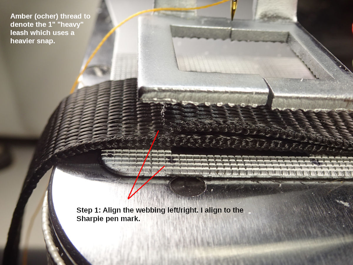 For the buckle-end, pay attention to the first tack closest to the buckle, and the last tack aganst the ring (smaller collars don't have two tacks between buckle and ring). It's easy to clamp too close (too high). When it starts sewing, it will slip down when sewing starts (revealing the the straight basting stiches outside the zig-zag). I wag the webbing side-to-side a little to let the clamp settle down if it needs to. If you don't do that, you'll get some slip in the first few stitches (the straight basting stiches will be revealed outside the zig-zag stitches).