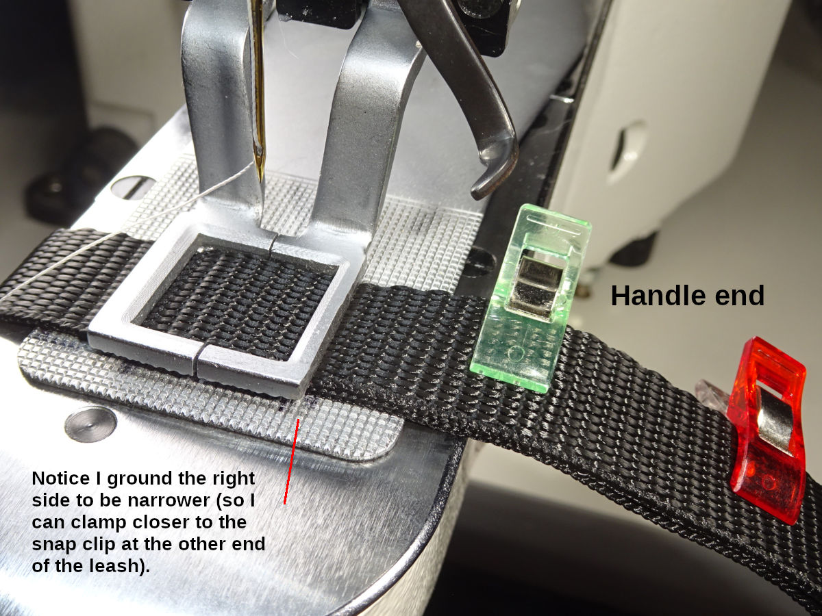 [3] The reason I drop the clamp onto the tri-glide: I started making collars with a Singer 201 whose standard foot is narrow, some of it even able to pass under the tri-glide. Doing that, I was able to make the overlap very short (for more adjustable range; fit more dogs). When I began using this LK1900BN, I wanted to keep everything the same. Dropping the clamp on the tri-glide worked. But, it has disadvantages (the piece is prone to shift because the clamp's grip on the plastic isn't as strong; the needle may hit the plastic.). You shoulnd't start this way. (It's probably not worth doing at all. I've got it dialed in now, but this added difficulty getting started with this machine. If I would've added 1/4" to the webbing length - started by clamping on the webbing - it wouldn't have been worth trying to clamp onto the tri-glide.). To do this properly I should have a custom clamp to fit. It's not worth doing that. It's hardly worth doing the improper way I do it.