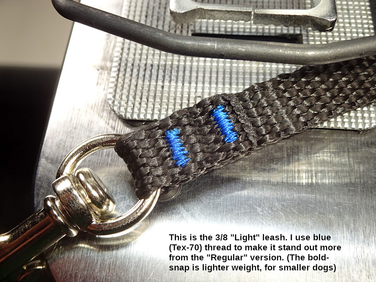 The photos show the "Light" version (using blue tex-70 thread & lighter-weight bolt-snap). I make a "Regular" version using "shark gray" thread (to denote a heavier-duty bolt-snap.).