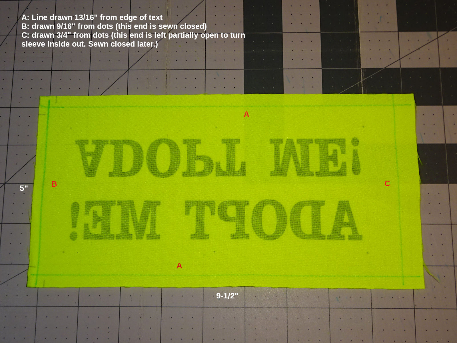 I was inspired to make & donate "adopt me" leash sleeves after seeing one made by Patience & Love.[1] Based upon that sleeve, I targeted these dimensions:
