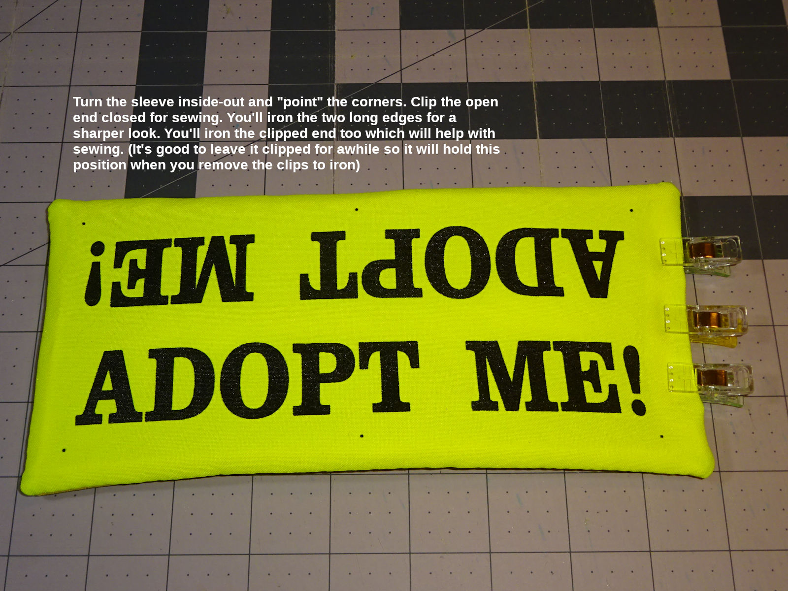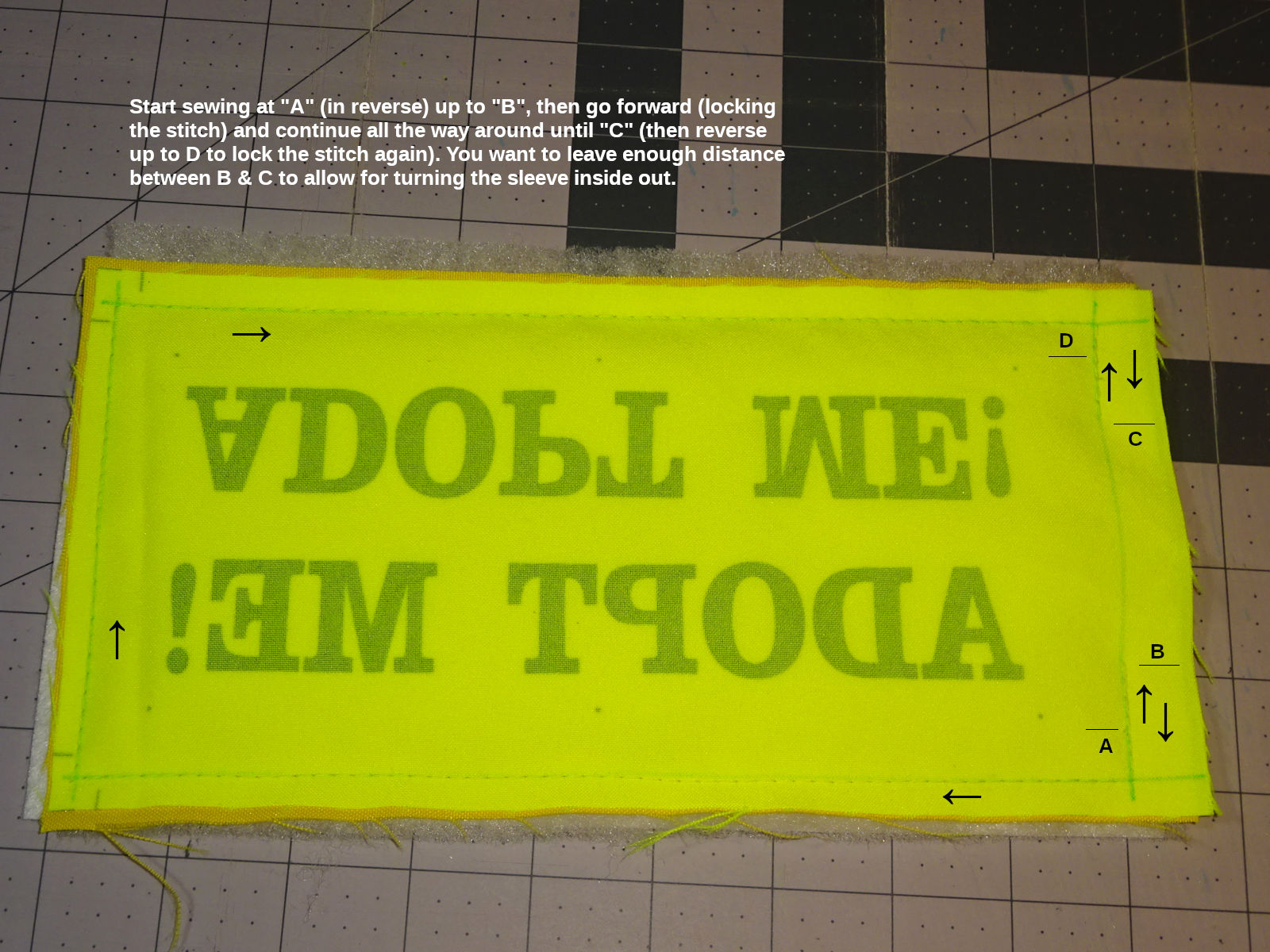 Note: When you turn the sleeve inside-out, the rear fabric's top side will be the exposed side. Fabric has a "finished" side which looks nicer (the unfinished side can look coarser). I like the unfinished side to be the exposed side on the back of the sleeve. It looks more like "the back," and the coarser finish might grip the leash better?