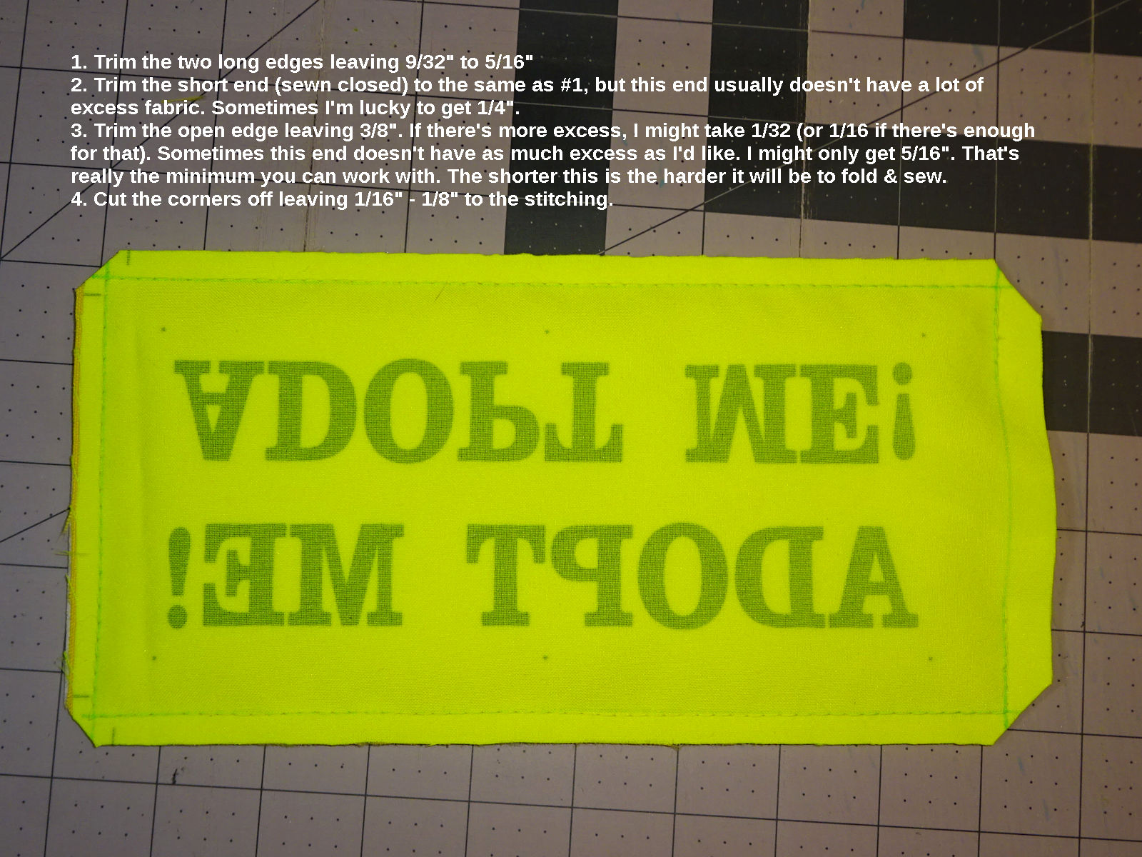 After sewing, I trim the two long edges to be 1/4" + a bit more (1/32" to 1/16") past the stitches. I trim the short edge (sewn closed) to be 1/4" (a hair more depending on how much there is to work with. Sometimes this end is a little short due to the way I shrank the 6-sleeve artwork. The space between the two groups of 3 sleeves shrank.). I trim the other short edge (left open) to 3/8" or a hair (1/32") longer. Being a little longer helps with folding it inside & sewing closed. 1/4" works if that's all you have. But, if you have more, it's easier to fold and sew closed: