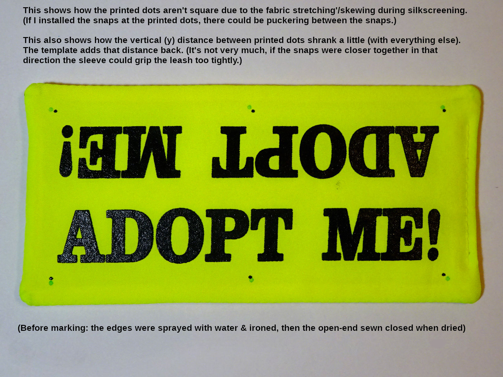 However, I ended up shrinking the printed dimensions about 4% (but not the distance between snap holes in the y - vertical direction which would change how the sleeve fits around the leash). This photo shows the P&L sleeve (top, with embroidered text) & the sleeve I make (bottom, with silkscreened text):